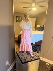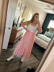 Loved this skirt!! Was slightly too big so would recco sizing down. There is a lot of fabric. Such a fun summer skirt!