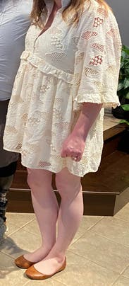 Wore for my son’s promotion ceremony. Perfect babydoll but a little wide in the waist. So comfy if not the absolute most flattering. Still loved!