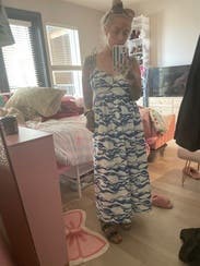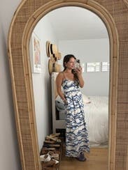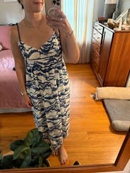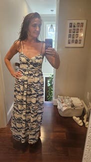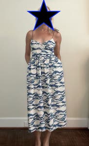 Wore this several times; the lightweight, floaty fabric is perfect for summer. The print is stunning and always got compliments. No lining at the bottom, but it didn’t feel see-through. Has pockets, which is a plus. The chest area can be a bit loose (I’m smaller chested) but straps are adjustable. Great for summer parties, dinners, or casual days with friends.