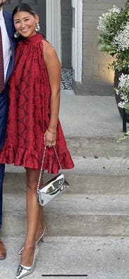 This is a red carpet status mini dress. The bow in the back was so chic. I am 6'2" so wanted a safe bet, a swing dress, and loved it so much I may buy it. The sutdle rose pattern added interest. wore this to a September wedding at an estate in new england. Essentially everyone else was wearing neutrals. I'll just say every old man at the wedding asked "where are you from." Not creepy though. Rent this is you want to be comfortable, stand out, and received 1 zillion compliments