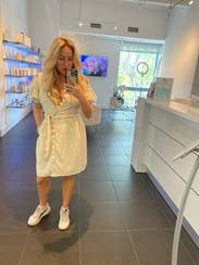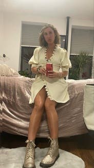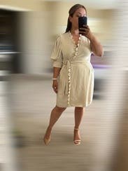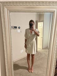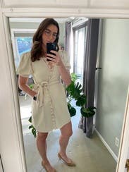 Pros: beautiful textured weighty fabric that is great for transitional weather and not see through despite being cream colored, lovely trim, pockets! Cons: runs very very small in the ribcage and bust. I knew this going in from other reviews and ordered up two sizes. It worked ok, but even then, the bust darts weren’t placed appropriately for me and I had to wear a cami underneath. Because of the tight ribcage, I also wore the waist lower than intended. Because I had sized up so much to accommodate my bust/ribcage, the sleeves were huge and long. (A silver lining though is it helped the length be more appropriate for work.) The skirt also doesn’t have that much overlap so it does come open quite a bit when you sit down. Overall, it ended up looking cute and I’m sure no one else notices things like dart placement to know that it’s not laying the way it’s intended. (I sew clothing.) Cute for a rental and probably great for a smaller chested gal, but I wouldn’t buy it for myself.