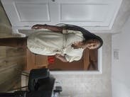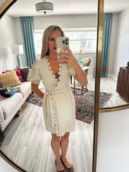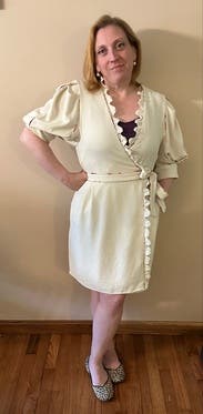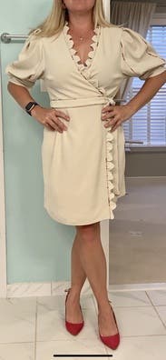 Wore this dress to say “yes” to the dress. Based on reviews, I sized up one size and glad I did. As always, wrap dresses are difficult if you’re a pear shaped like me, but overall this fit well. Beautiful cream color, thick material, and fun scalloped edging with a splash of color.