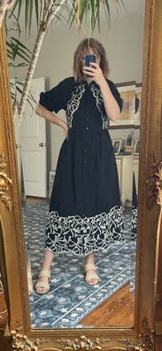 Was a bit tight in the chest but I sized up and it didn’t gape, just was snug. Embroidery is really lovely, and I found this more flattering than other dresses of similar shape