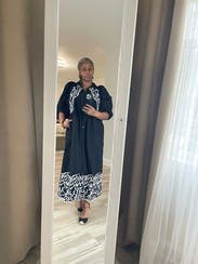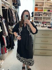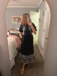 This was an easy to throw on maxi dress for my 5 ft petite frame. Had pockets and the embroidery was really pretty and made it unique. The material is thick and hard, so don't expect a soft flowy dress!