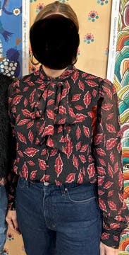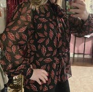 Cute, interesting top. Drapes really nicely and can be worn on own or fits well under a blazer or cardigan. I thought the pattern was lips when viewing online, and was disappointed to see it is a rust colored leaf pattern. Pretty but not as fun! The 44 was too big for me, I should have sized down 1-2 sizes.