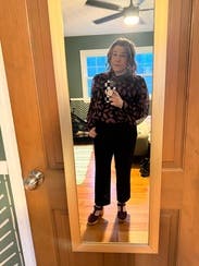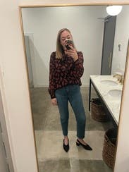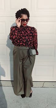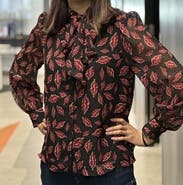 I love a blouse with a bow and this top gives professional, soft, and stylish. The print looks like leaves, so it is bringing in fall in style. I wore it for a work meeting and got many compliments. The fluffy bow and sheer arms are the cherry on top. I think it would look cute with jeans too for a cute casual vibe.