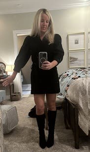 This dress is super cute! I had to order a smaller size than I would’ve liked, but it still fit, was just tight through the arms. Love the wrap waist and ties, so flattering! Slightly short, but I wore with tall boots so it didn’t look super short!