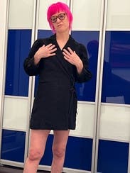 I really liked this sexy blazer dress although it was short enough that I bought some faux leather short shorts to wear under it when I actually wore it out of the house. I liked that it was a cool cotton material and might rent it again in the summer months for that reason. It wraps very securely with no gaping open. My only complaint is that in the photos, it looks heavy and blocky in the waist.