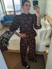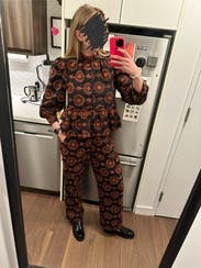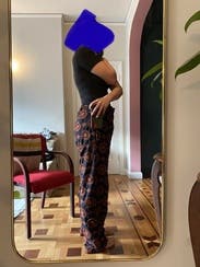 Both the 38 and 36 fit well on my waist/hips/legs, but the 38 had the length that worked best for me and I have an average torso/leg ratio. The outfit is super comfortable and very eye catching. I wore with a thick soles patent oxford, similar to the app model. I have the top on backward in the photo but you get the gist. 😂 Best to use a steamer vs. iron for any wrinkles but they came in pretty good ready to wear shape