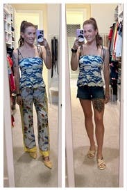 Loved the shape of the top. Scallop detail with a slightly edgy pattern. Both shorts and the top were too big. I used a safety pin to gather some of the extra fabric on both and draped the blazer to cover it. I felt great but took a little work. Size down!