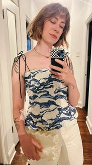 I received SO many compliments on this top. From the print to the scalloped edge, it was such a win!! The structure is a bit boxier, but with my small chest it still worked perfectly.