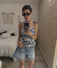 I’m 5’5, 120lbs, 34D. No bra needed. Styled with Pistola Jean short and apricot/eggshell/light neutral colored mid heel mule