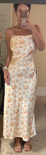 It’s a pretty dress, unfortunately I wasn’t able to wear it to anything. TTS. Silky fabric with a liner.