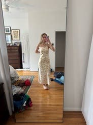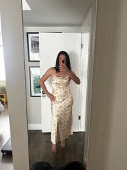 This dress is to die for. The way it fit my body made me so confident, it’s also so soft and the straps I believe can be retied in the back if u need it a bit tighter and the cowl neck never goes too far down where I felt self-conscious of a nipslip. I rented for a trip to Austin and it looked perfect with cowboy boots and an oversized jean jacket going to dinner and I honestly never wanted to take it off. It’s so girly and cute while still being elegant and simple. I decided to even wear it with a mini turtleneck to work when back in NYC and make it a bit more edgy and got so many compliments from coworkers and people on the street. The slit in the back is fun and makes the dress moveable. The way it sits it never is harsh on your curves or if you’re feeling a bit heavy after lunch, it somehow always smooths you out. HIGHLY recommend.