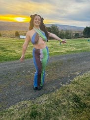 Wore this to an outside EDM concert where the temperature had a chance of dropping during the night. The material is thicker so be wary if wearing in a hot climate. Once the matching top is correctly placed and tightened around the neck area, it doesn't move. For someone with a bigger bust, I did have some underboob show on big movement, but was covered. The top has a lining to prevent movement. Overall I got so many compliments on this outfit from everyone I passed and felt very comfortable dancing/walking throughout the night!