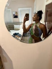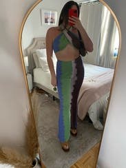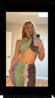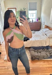 I couldn’t figure out how to wrap this in a way that was both comfortable and flattering. The back was so big (accidentally got an L instead of an M thinking it’d be super cropped) that I had to double knot the back and halter tie until it was really tight against my neck and rubbed. Still a cute option for Pride celebrations but wouldn’t rent again