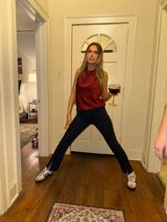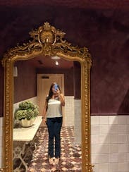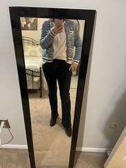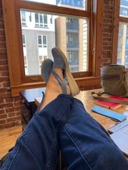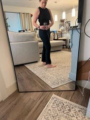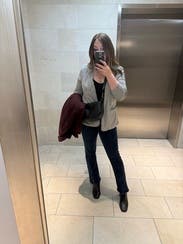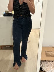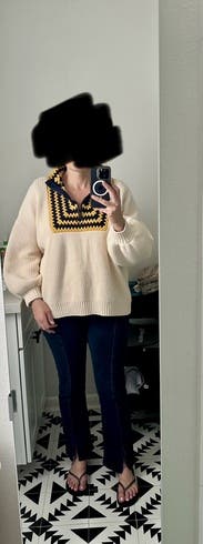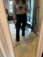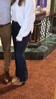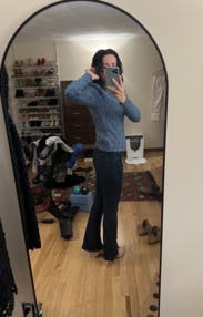 These jeans are cool. At first I did not like them…but ended up wearing them out “just because I had them” for a regular day - casual office attire (styled with blazer and flats), running errands, etc. Well, let me tell you: people love these jeans! I got compliments everywhere I went. So of course I wore them at least 5 more times!! 😂 I was actually sad to send them back; but am also not sure I’ll rent them again because there are too many other jeans I want to try. Not much stretch. I could have sized up. P.S. this bathroom selfie is the only photo I have - not styled! I am wearing the RHODE Finn sweater size L-XL, also from RTR, which is a 5-star rock star piece. The $1 drug store flip flops are my own. 😂