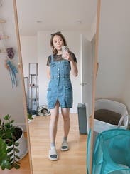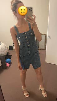 So cute and shockingly soft denim. Can be layered over a t-shirt or worn on its own. The slit in the front comes up a little high, but isn't a problem for me at 5'1".
