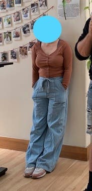 Really, really cute pair of jeans. Tying the waist is odd as the straps twist all the way around your waist and back to the front. They were high-waisted for me, which made the fit snug when bending down and raising my legs. The front pockets were also oddly shaped, so it was weird trying to put my phone or wallet in them. The jeans also sit just above the floor and rest on top of sneakers, so they just barely fit for my height (5’4).