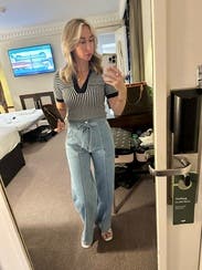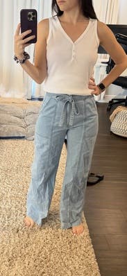 I am always reluctant to rent jeans because sizing is so inconsistent across brands, it’s just a roll of the dice if it is going to fit. In this case the reviews were super helpful. I chose a size that is 2-3 sizes larger than normal for me (I’m pretty typically a 26 or 27 in jeans ) and these fit great! I am short, so they aren’t cropped on me , but they worked as a wide-legged , full length style. They are fairly generously cut in the hips and thighs… at least, they were not too skinny through that area. They are quite lightweight , so perfect for warmer and transitional weather . The attached belt is a bit odd and has to be tired in front , but that isn’t a deal breaker for me. I’ll keep them a little longer as I’ve really enjoyed wearing them.