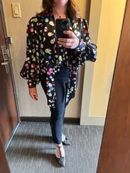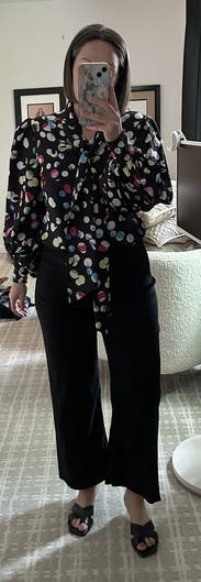 I loved this silky top with its big bow and little pops of color. The sleeves are also great -- poufy but drapey, so they don't overwhelm. Excellent for zoom meetings while working from home! Fit is true to size and a good length for tucking.