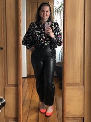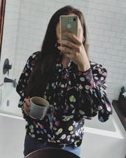 This shirt was a lot. I loved the bright pattern, and the bow was cute, but the sleeves were SO poofy, and all of it together felt kind of overwhelming. It reminded me of Jerry Seinfield's "puffy shirt."