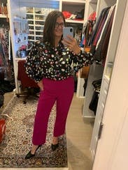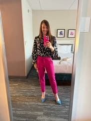 The eve rented every year be of these gorgeous Finley Hunter Bell blouses and this is by far my fav. Fun print in a nice satiny but not too shiny fabric. I paired this with the Trina Turk berry colored slacks which made a perfect pairing!