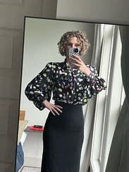 Received lots of compliments on this blouse. Wore with both black dress pants and jeans to the office. Fits TTS. I love a high neck blouse with interesting detail for days when I’m behind on hair washing. A high ponytail looks intentional (vs sloppy) with this type of workwear.