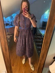 As others have said- the elastic on the arms is tight (you’ll have marks on your arms after wearing), and the way the sleeves are attached to the bodice is odd- very constricting. Outside of that, I loved this dress. A little ridiculous prairie / quilt like, but what a fun rental. High quality, fun for a dinner out.