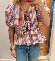 Hunter Bell's Carly Top in Lighthouse Gingham features a playful gingham pattern with a peplum silhouette and bow tie accents, offering a relaxed yet flattering fit. Pair it with denim shorts or a mini skirt and sandals for a casual, polished look.