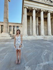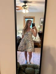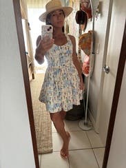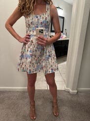 This dress has a cute pattern and fun cross straps in the back, with the belt around the waist. It's definitely short if you're tall, but still wearable!