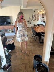 Arrived NWT. I really love this dress. It’s fun and flirty. I wore it on a date and then wine tasting in hot weather. The pattern is a bit different, the shape and fit are great. I had a little room in the waist and may have been able to size down but I always worry about smooshing the girls so I tend to size up. There’s no stretch, the fabric is pretty thick, and the dress is well constructed. She’s a keeper!