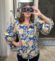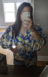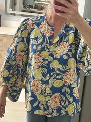 This arrived fresh with the tags on and I loved the fresh, vibrant lemon print too! Perfect pop of color for video calls! There is lots of volume in the sleeves but I don’t love the way the shoulder detail sticks out. Otherwise fun!