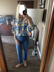 I wore this fun top with white jeans an minimal accessories. The shirt stood out! The fit was good with high waist jeans. The sleeves were beautiful.