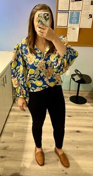 Love this floral blouse especially the stunning color and pattern. It’s super soft and silky and feels great in your skin. Wore it to work worn a pair of black pants and got tons of compliments. May buy it.