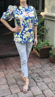 I really liked the lime green with the electric blue, color, it’s a fun print. I could have sized down to a medium but ended up tucking in the large blouse and it worked fine with jeans.