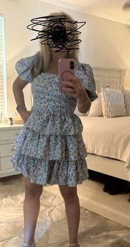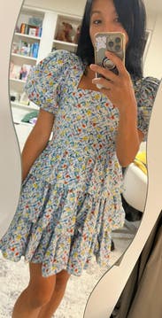 I’m between sizes and decided to size down — it ended up being a touch fitted in the chest. The pale blue floral print with hints of red, yellow, and green is gorgeous in person. The square neckline and puff sleeves give it a romantic feel, and the layered bottom creates a flattering waistline. It hits just above the knee on my petite frame. I did need a little help zipping it up, but overall it’s a lovely, feminine dress.