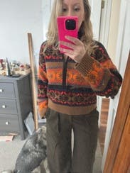 Easy, warm, maybe a little itchy, short. I like the zipper front. I didn’t end up styling it today but could def see it looking cute with a button up/fake collar underneath to dress it up a bit. The colors are as beautiful as they appear.