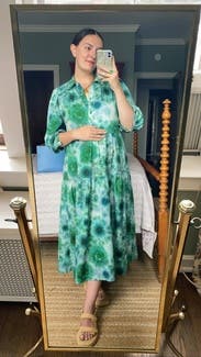 I am *obsessed* with this dress. It is the one item from my shipment I have worn several times this month because it's just the perfect spring second trimester dress! For reference, I am 20 weeks pregnant in this picture, wearing my pre-pregnancy size M. There is plenty of room, but it doesn't feel like I'm drowning. The buttons on the sleeves are kinda tight so I just left the sleeves unbuttoned and that seemed to work pretty well! I've worn it with sandals to the flea market and with sneakers out running errands. I even had two strangers compliment me on how great it looked!