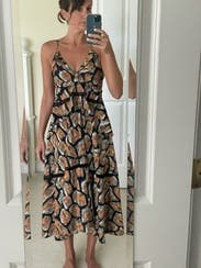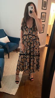 Casual yet elegant summer dress. Fits large overall - recommend to size down. Adjustable straps are super helpful. Unique print, mostly black & white, with shades of yellow/orange and blue. Keeping for a full month and will definitely rent again.