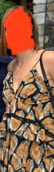 This was great for vacation. Loved the colors/fabric. It’s very light and breezy, great for hot days. Loved that it’s a bit low cut/strappy. It does have a strange bit of fabric that hangs on the front that makes it a bit unflattering from the side around the belly. BUT I think the other flattering parts of the dress make it overall a flattering look. I really liked the dress overall.