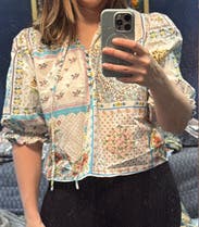 * Petite review * 5’2 113 lbs usually wear a XS so tts - this too is rocking the Western trend! I tied a double knot with the long ties to keep them under control. Loved the puffy sleeves and easy on the eyes pattern. This top is made of MID-WEIGHT fabric… I feel likely best worn with high waisted bottoms. I tucked my blouse into a pair of Rome shorts by the designer Cezane. Love this French designer - not on RTR. Wearing the top shopping with girlfriends then lunch afterwards. This top might be a bit too whimsical for the office but definitely could be pulled off with a blazer over it. 10/10 for me. No downside to this sweet number.