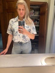 This is a cute shirt. I really like the pattern and it did fit well. With that said, it's a very cropped shirt that had to be worn with very high waisted pants. I'm just not comfortable in that short of a shirt, but I really wanted to like it.