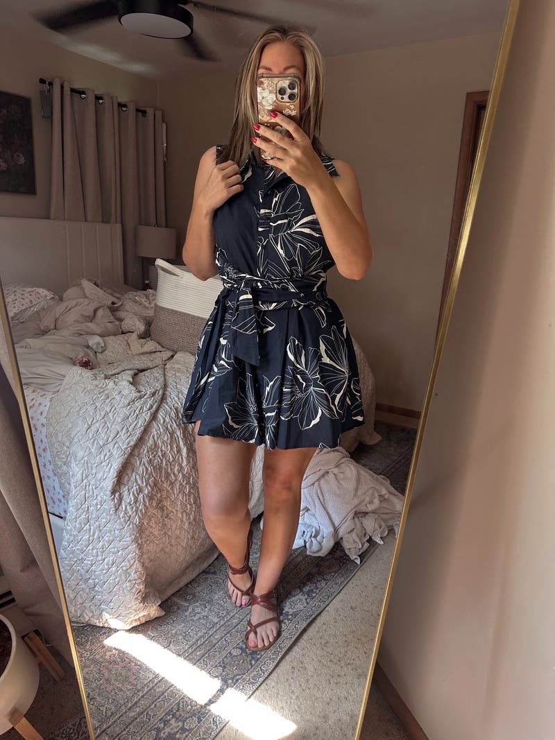 Color: BLUE | Print: FLORAL | Fabric Type: | Fiber Breakdown: 100% cotton | Category: Casual Dresses | Neckline: Collared | Sleeve Length: Sleeveless | Closure Type: Front button closure | Shoulder to hemline length: 34.5" | Length: | Inseam: | Rise: | Leg opening: | Slit length: | Imported.