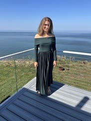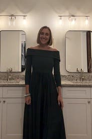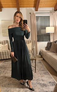 The dress exceeded my expectations for a last minute Christmas party. The skirt was surprisingly unwrinkled coming out of the bag, the color is a deep evergreen/emerald, and was the perfect length with low or high heels. I opted for kitten heels for comfort. While fitted by design, the bodice wasn’t too tight in the Size 4. The arms were snug but served to hold the off-shoulder neckline well. Would absolutely rent this again!