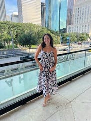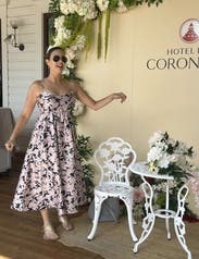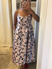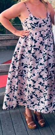 I absolutely adored this dress and had so much fun wearing it. The dress itself fit a little tight on me however, that was helpful for the bust area. I wore a backless sticky bra with it and everything was held in place. I wore it for a rehearsal dinner however, because of the tightness in the bust I don’t think I could have worn it to a more vivacious event like a wedding or party. The fabric is very light and soft and it has one of the best features a dress can have: pockets. Only other detail I did not enjoy were the straps are quite thin and kept falling down. Overall, would rent this dress again!