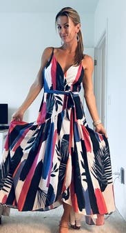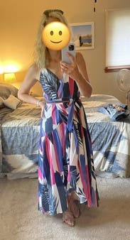 Wore this to a summer wedding at a winery, I loved it! It wraps nice, so very adjustable around the waist. A little low cut and long for me in the back since I’m 5’1. Overall great dress.