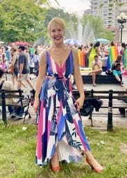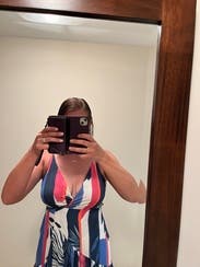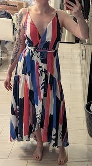 So this dress was such a win! Wore it all day to NYC Pride and it held up beautifully through crowds, intense heat and humidity, bike rides across the City, a picnic lunch on the grass, and dancing in the streets. It was light, airy, and the movement was great. The colors were vibrant but yet still sophisticated. Very comfortable and really enjoyed wearing it. As for sizing - I wore the XS and it ran a little big. I generally wear a size 0-2. I’m not quite 5’2” but managed the length with heels. I kept the adjustable straps as tight as possible. I also used a safety pin to keep the top closed. It is a wrap dress, and was able to make it small enough by cinching in the ties as tight as much as possible at the waist and doing a double knot in the bow at the front. Overall it’s a very forgiving cut and easy to self tailor. Loved the dress and would definitely recommend for a summer festival, concert or daylong outdoor event.