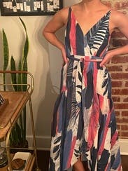 This is a true wrap dress so watch yourself on a windy day! I loved that the straps were adjustable and with the tie you could make it as tight or loose as you wanted. The material was soft and flowy, and had a bit of a high-low effect. Wore for a birthday party and got lots of compliments!