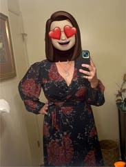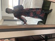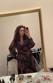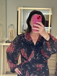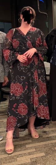 At the time of the photograph I was 165 pounds, so I feel like the dress fit true to size, not quite right for my body type. But a lovely dark floral chiffon. It was sent when my one time rental was not available, I didn’t select it for the event but wore it on Sunday morning around the house and felt like a fabulous Lady of the manor while eating breakfast with my family!